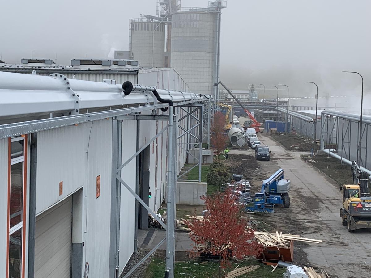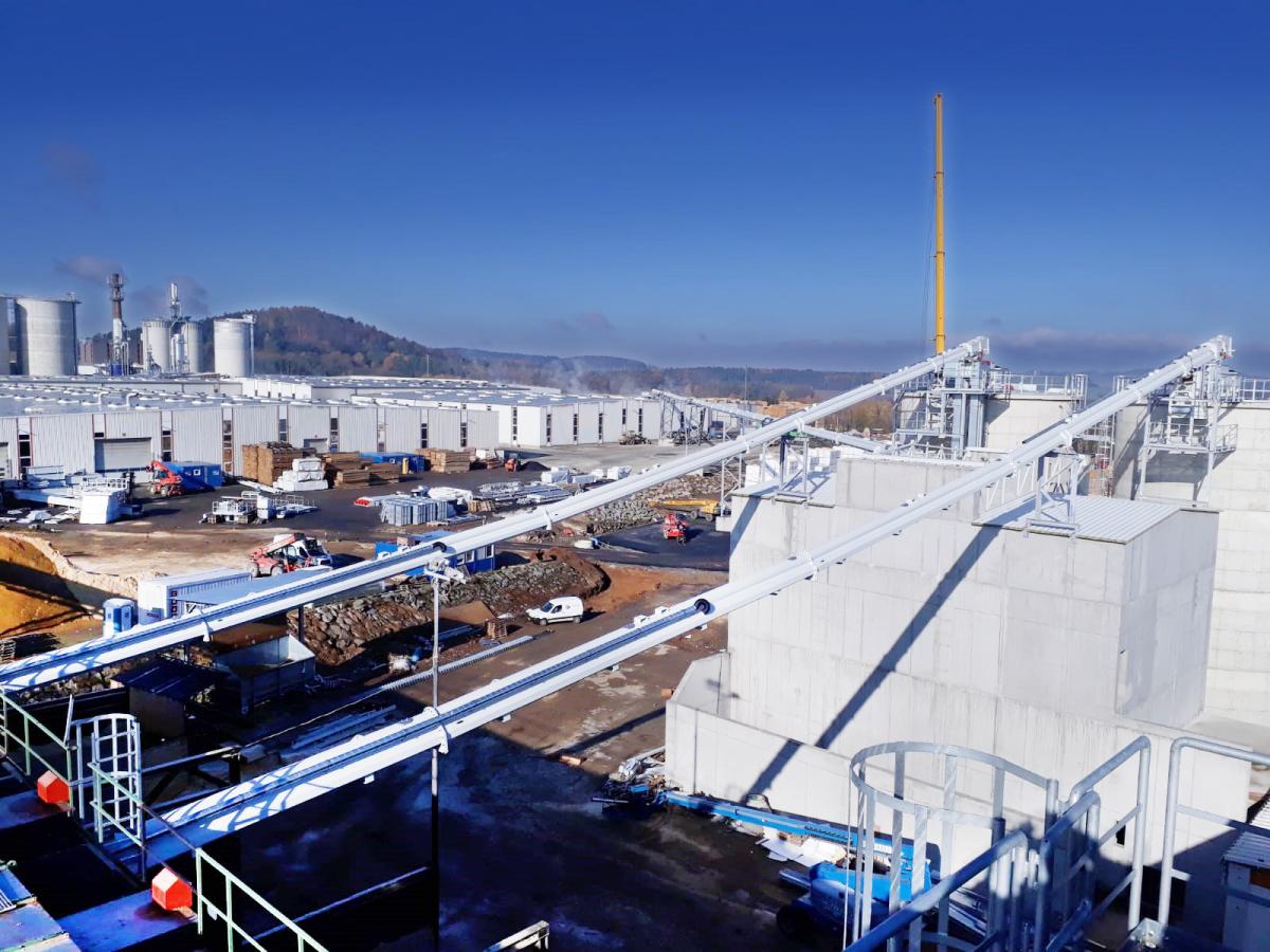 „Im vergangenen Jahr hatten wir für einen großen Holzverarbeiter vier Rohrgurtförderer der Baureihe Vecobelt mit einer Gesamtlänge von mehr als 500 Metern inklusive Stützen montiert“, berichtet Vecoplan-Bauleiter Norman Krieger. Zum Auftrag gehörten zudem der Stahlbau und die Begehung. Das Unternehmen verarbeitet hier Rund- zu Schnittholz und Massivholzplatten und erzeugt, mehr oder weniger aus den Abfallprodukten, Holzpellets. Für einen geschlossenen Wertstoffkreislauf veredeln Brennstoff-Spezialisten im Unternehmen Reststoffe wie Sägespäne zu Trägern nachhaltiger Bio-Energie. Die Vecoplan-Anlagen sollen Nass-Hackschnitzel sowie Nass-Sägespäne für die Produktionslinien fördern.