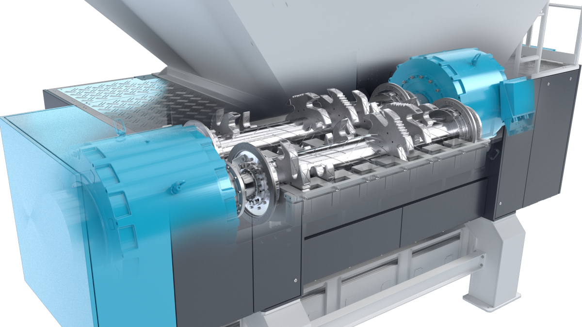 Die Idee des bewährten Antriebskonzepts von Vecoplan entstand vor knapp 20 Jahren, als die Techniker einen effizienteren Antrieb für die Zerkleinerungstechnik entwickeln wollten. Denn die Schredder hatten immer mehr zu leisten und wurden immer größer. Das hatte auch Einfluss auf die verwendeten Antriebe. Diese mussten sie mit dem gesteigerten Durchsatz umgehen können und über genügend Drehmoment verfügen, um auf Störstoffe zu reagieren. Der damalige Konstruktionsleiter Wolfgang Lipowski stieß eher zufällig bei der Lektüre einer Ingenieurszeitschrift auf einen Beitrag über den Synchronmotor. Die Dynamik und Beschleunigung beeindruckten ihn. Für ein schnelles Hochfahren nach dem Abbremsen im Zerkleinerungsprozess schien dies die perfekte Lösung zu sein. Ein weiterer Vorteil dieser Antriebsvariante: Mit einem Frequenzumrichter kombiniert, benötigen sie im Gegensatz zu herkömmlichen Elektromotoren kein Getriebe – das erforderliche Drehmoment wird über ein Magnetfeld erzeugt und wirkt direkt auf die Zerkleinerungswelle. „Ein Getriebe bedeutet immer Reibung“, erklärt Baldus. „Störstoffe im Material verursachen Stöße im Zerkleinerungsprozess, die unter anderem die Flanken der Zahnräder oder die Riemen der Riemenantriebe auffangen müssen. Dadurch verschleißen diese Bauteile. Das erfordert kurze Wartungsintervalle, und das Servicepersonal muss die Komponenten regelmäßig tauschen.“