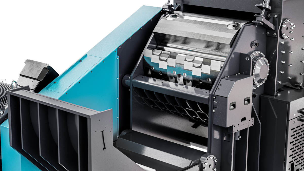Um Staubaustritt beim Zerkleinerungsprozess zu minimieren, ist die Maschine mit einer Verkleidung ausgestattet. Diese kann der Techniker vor der Durchführung von Servicearbeiten mit wenigen Handgriffen demontieren. Eine sich nach unten öffnende Haube ermöglicht einen schnellen Zugang zum Rotor. Integriert in die Haube ist zudem eine Wartungsbühne. Servicearbeiten können somit bequem und sicher erledigt werden. Ein Drehwinkelgeber sorgt für optimales, an das Eingangsmaterial angepasste Heben, Senken und Dämpfen der oberen Einzugswalze. Der Antrieb der oberen Einzugswalze ist innenliegend. Sowohl ihre Schmierung als auch ihre Temperaturüberwachung erfolgen automatisch.