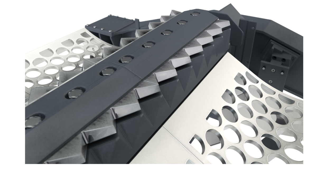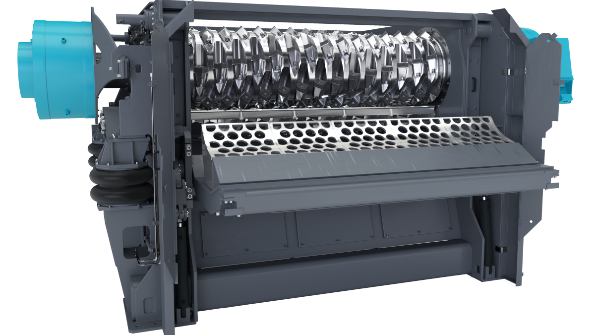 Die zwei Vollstahl-Rotoren erzielen mit ihren großen Schwungmassen einen ruhigen Maschinenlauf und eine hohe Durchschlagskraft. Das Zusammenspiel der beiden Rotoren mit dem gemeinsamen Gegenmesser und den Lochsieben führt zu einem sehr gut separierfähigen und homogenen Output. Durch hydraulische Wartungstüren wird das Wechseln der Verschleißteile und das Ausschleusen von Störstoffen erleichtert, auch bei komplett gefülltem Einfülltrichter.
