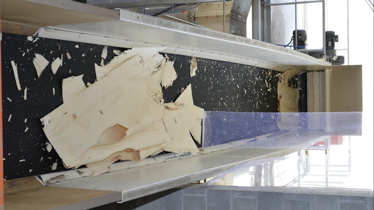 Um Schälfunierreste aus der eigenen Sperrholzplattenproduktion effizient zu lagern und zu entsorgen benötigte der Kunde eine ganze Entsorgungslinie. Diese sollte mit den vorhandenen Komponenten harmonieren.
