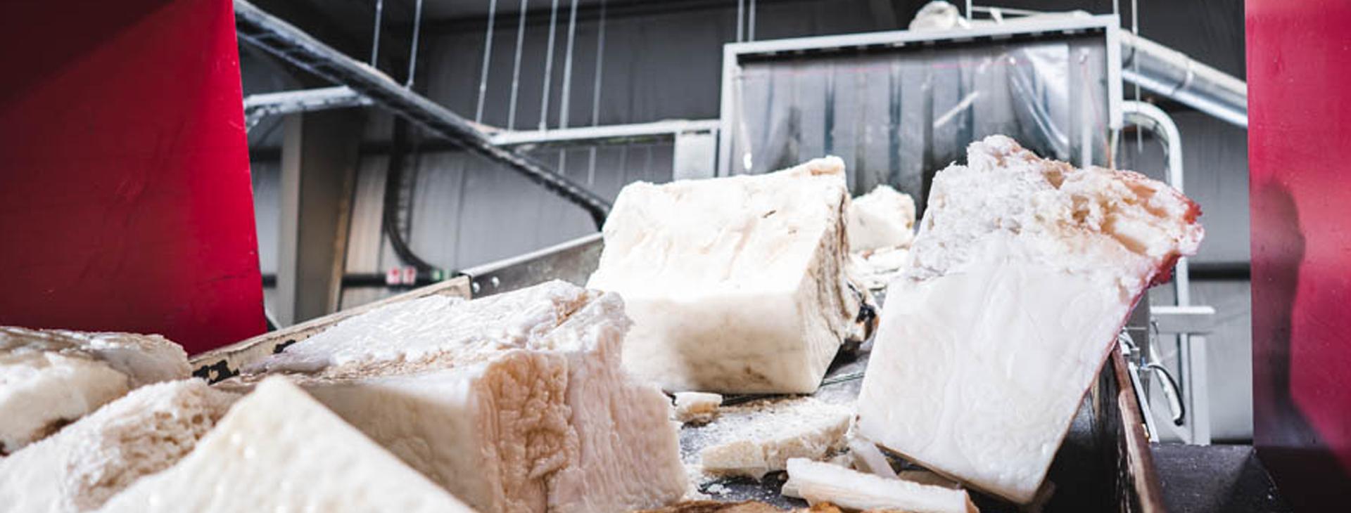 At the Eschwege site, General Industries Deutschland (GID) recycles challenging post-consumer waste from foamed plastics (EPP/EPE/EPS) as well as post-industrial waste in the form of start-up lumps and punching waste. The Vecoplan shredder type VIZ 1700 can process a wide range of materials for the special requirements and continuously feed the extruders via adapted conveyor technology.