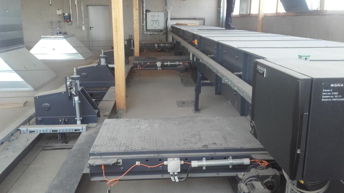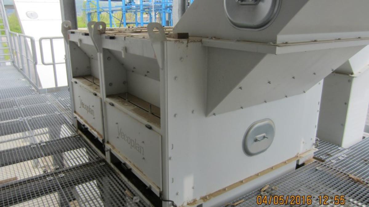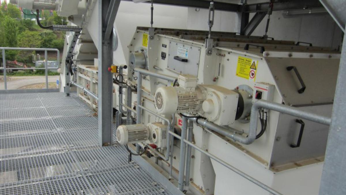 Trucks with a loading volume of 90 cubic metres deliver the biomass and deposit it on a push rod discharger. This consists of hydraulically-driven push rods which lie next to each other and alternately move forwards & backwards slowly, transporting the biomass to interim storage in boxes at a volume of 270 cubic metres per hour. On its journey to the boxes, foreign bodies such as metals or excess lengths must be removed from the biomass. To achieve this, a powerful magnet was installed above the moving biomass to pull screws and nails out of the material. A disc screen then removes wood pieces that are too long. The sorted excess lengths go directly to a container.