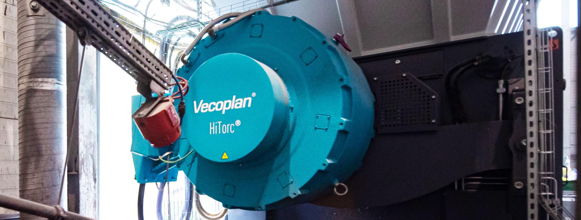 Vecoplan’s engineers came up with the idea for the HiTorc drive concept almost 20 years ago when searching for a more efficient drive for shredding equipment. Shredders were having to take on tougher and tougher jobs, and the machines were becoming bigger and bigger. This also had an influence on the types of drives that could be used. They had to be suitable for increased throughput and deliver enough torque to handle foreign material. Wolfgang Lipowski, the design manager at that time, ran across an article about synchronous motors more or less by chance in an engineering journal. He was impressed by their power and acceleration. Their ability to start up quickly after braking seemed ideal for shredding. A further advantage of these drives is that they produce the necessary torque by means of a magnetic field that acts directly on the shredder shaft. Unlike conventional electric motors, they do not require a gearbox and instead rely on a frequency converter. “Gears always mean friction,” explains Baldus. “Extraneous material causes shocks in the shredding process that must be absorbed by the flanks of the gear teeth or the drive belts. These components wear out and have short maintenance intervals. The service personnel have to replace them on a regular basis.”