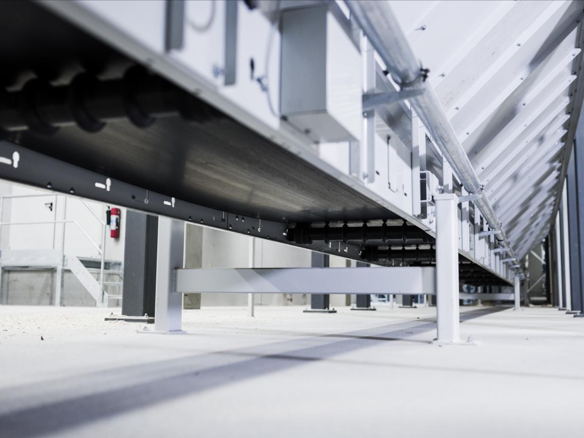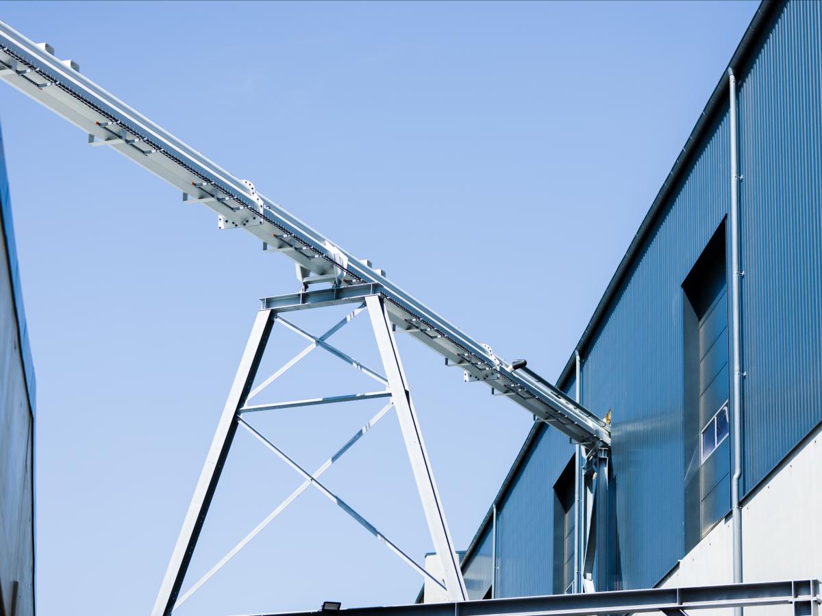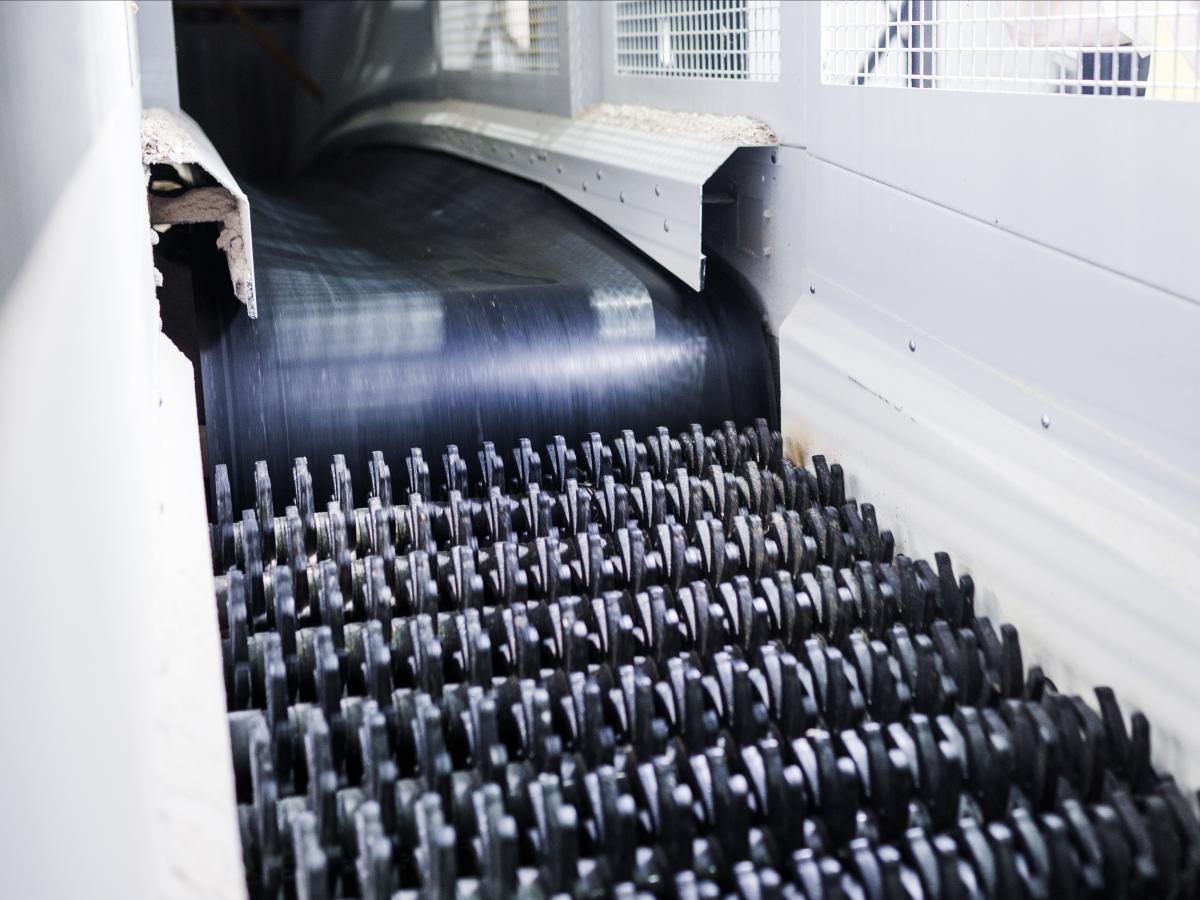 Each drive station is equipped with two scrapers. Users can adjust the front head scraper and the carbide scraper from outside the machine. The components can be re-tensioned quickly and easily with a ratchet. The front head scraper is flexible but strong enough to remove extraneous materials from the belt. The carbide scraper is more thorough and prevents resin, for example, from sticking to the belt. These scrapers reduce maintenance times, increase equipment availability, and reduce material carry-over. The system conveys the material at a maximum of 2.5 metres per second. Another Vecobelt, approximately 80 metres in length, carries the waste wood from the screening station to the pellet plant.