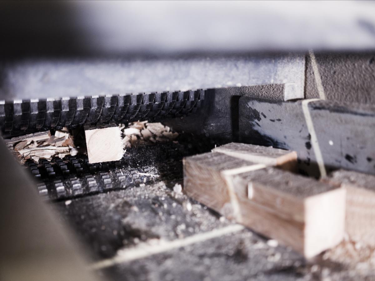 The waste wood falls directly from the sawmill onto the conveyor system, ready for the next stage of pellet production.