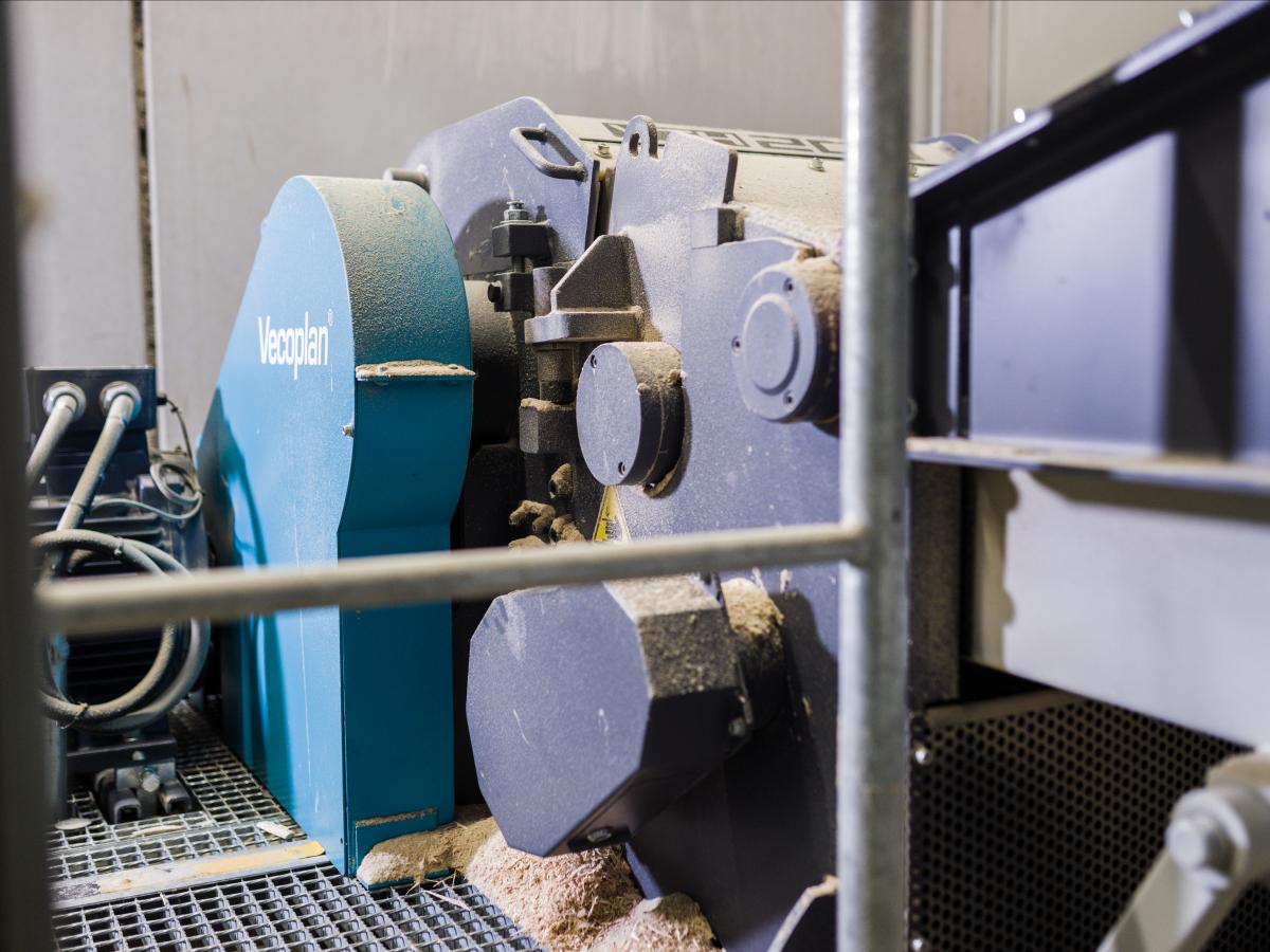 Motor noise fills the hall. Vecoplan expert Mützel points to the equipment installed by the Vecoplan team. From the saw line, sawdust and chips fall through the floor of the saw hall onto a long conveyor belt. The conveyor technology transports the material to a star screen to separate excess lengths. The matching waste wood falls onto another conveyor belt. The screened excess lengths and offcuts from the board sorting are transported to the drum chipper via belts and vibrating conveyors. These feed the material to be processed horizontally to the machine. Vecoplan technicians adapted the chipper to match the sawmill’s tasks and achieved a homogeneous and high-quality result.
