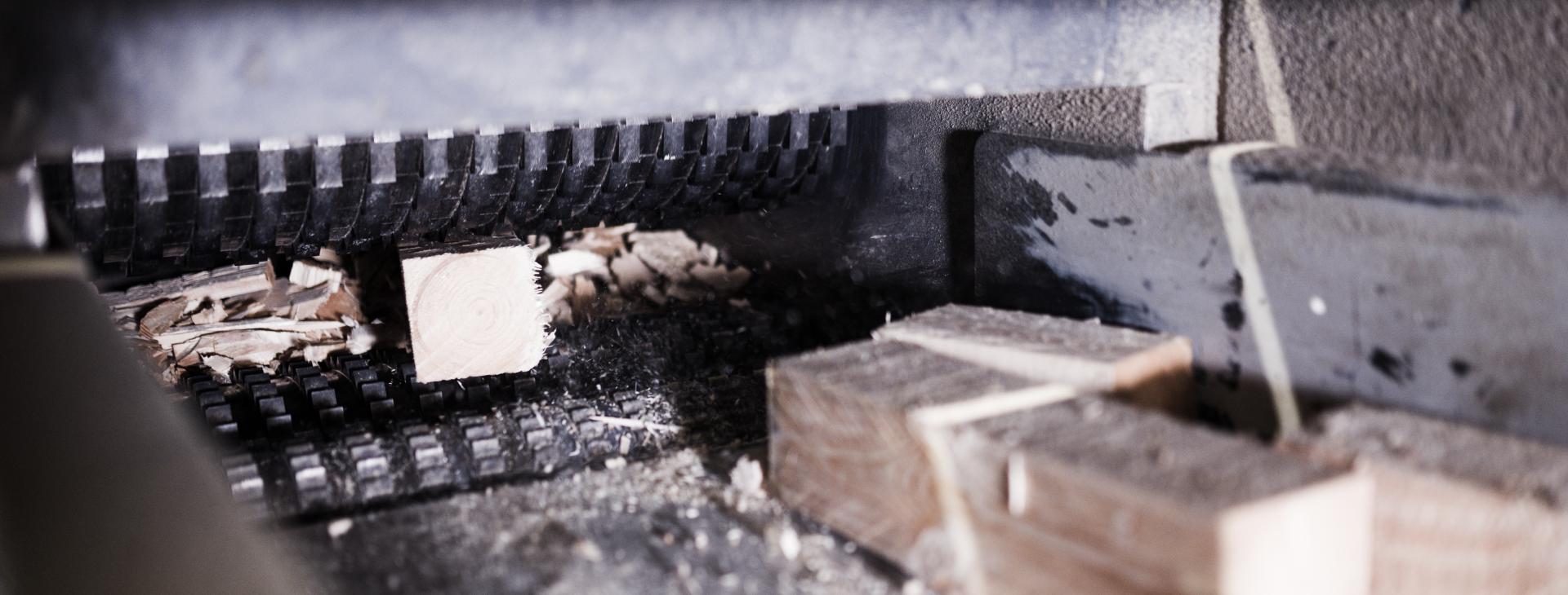 The drum chipper shreds the resulting waste wood to dryer-capable chip size.