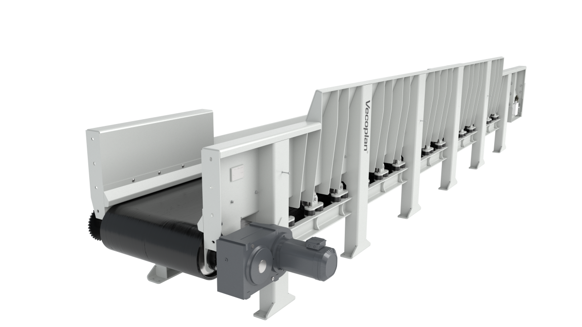 Safe and robust feeding of even massive logs into the chipperThe Vecoplan drum chipper feeding conveyor is designed for the horizontal feeding of wood trunks into a drum chipper. The solid welded construction with the generously designed support rollers and the conveying belt specially designed for this application ensure the high availability. This conveyor has a reinforced feeding area adapted to the length of the logs, on which the logs to be chipped can be fed by means of an upstream chain cross conveyor or by means of a log gripper.