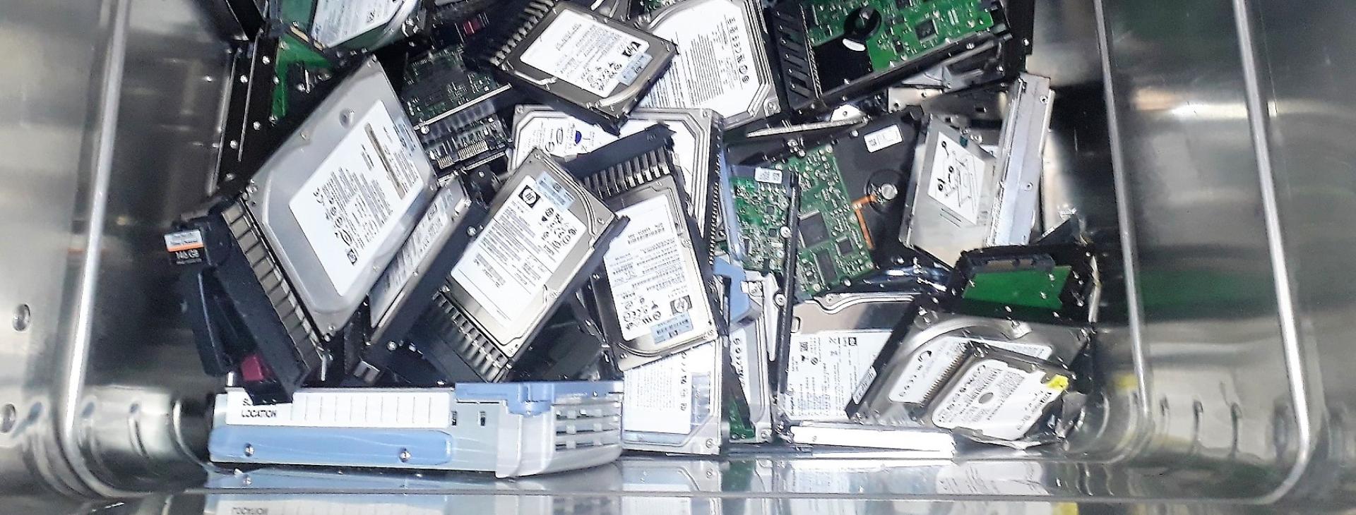 All components inside the machine that come into contact with products are made from anti-magnetic steel to prevent hard drive magnets from sticking to them. The machine is loaded simply through a closable in-feed shaft.